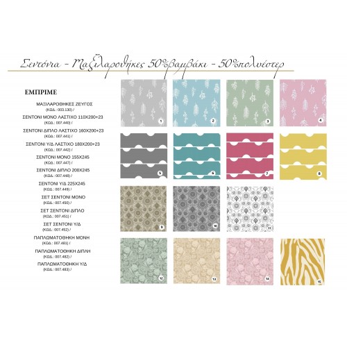 Σεντόνια εμπριμέ σε διάφορα χρώματα και σχέδια. Διαθέσιμα σε μαξιλαροθήκες, σετ μονά, διπλά,Υ/δ και μεμονωμένα σεντόνια με ή χωρίς λάστιχο.